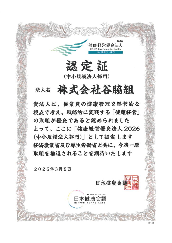 この度、(株)谷脇組は本年度も経済産業省及び日本健康会議が共同で選定する『健康経優良法人2026』(中小規模法人部門)に認定されました。