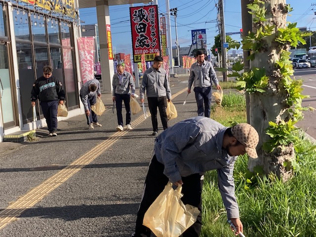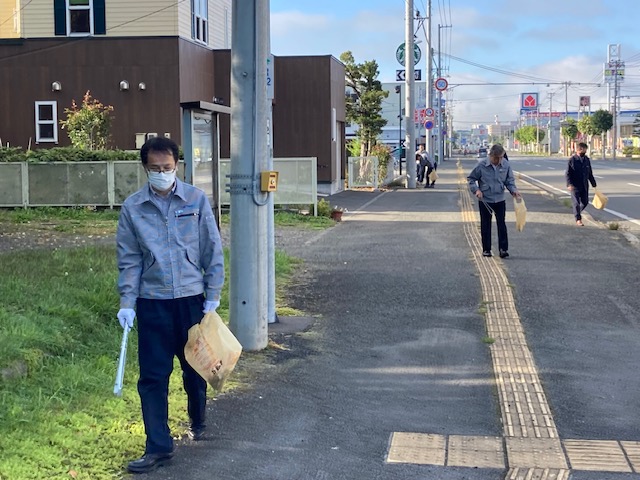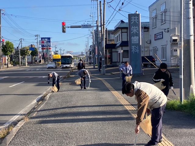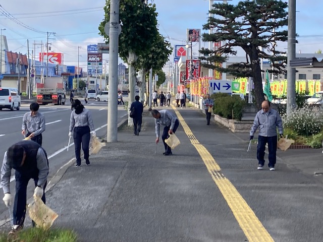 本社前の国道39号 旭川市大雪通1丁目から6丁目の歩道部分で4班に分かれ、空き缶やペットボトル、たばこの吸い殻、包装等々各種ゴミを収拾いたし ました。